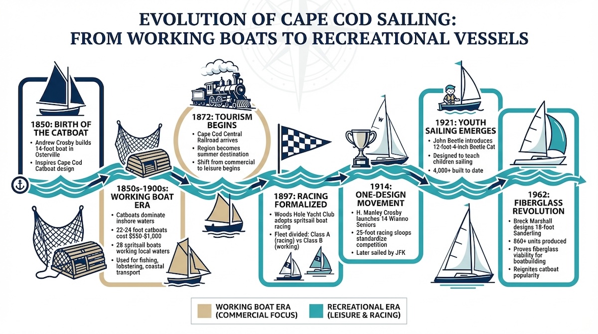 As the economy and technology evolved, these practical workboats found a new purpose in leisure. The arrival of the Cape Cod Central Railroad in 1872 turned the region into a summer hotspot for tourists, while advances like gasoline engines and outboard motors made sails less critical for commercial work [5][6].